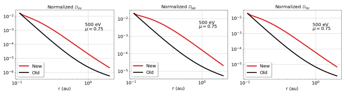 图 1:从靠近太阳0.1个天文单位到远及2个天文单位,针对500电子伏特的电子,新旧扩散系数随日心距离的变化特征被清晰地展示和比较。