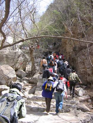 2006年4月22日,中心团委组织了上方山踏青。随着春天急促的脚步,各种植物都开始伸展肢体,绽芳吐绿。在室内窝了一个冬天的大家也都踊跃报名,迫切希望在郊外的绿意与空气中畅快撒欢。这次活动参加人数达120多人,共三辆车,由中心副主任李永海、团委书记任建华带队。早上8点从青年公寓出发,行程2个小时后到达上方山山脚。 北京春天风大是有名的,前几天又刚刚刮了次沙尘暴,所以早早就开始关注天气,祈祷登山那天会是个风和日丽的天气,可天气预报却说近期大风会持续,而且还会在这天加强,心里不禁有些遗憾。但是来到上方山,却是微风习习、阳光普照,看来老天还是很照顾我们喔!呵呵! 团委的耿浩8点半就已在入口处等候,他已和售票处联系好,我们直接凭着在车上发的票进去即可,这样省去了自己购票排队的麻烦! 上方山国家级森林公园是华北地区保存最完整原始的次生林。因其森林茂密、山峰奇秀、洞穴深奥、环境幽雅、气候宜人,空气清新。历经一千九百多年沧桑岁月,现已成为休闲探奇好去处,素有“南有苏杭,北有上方”美誉。 上午10点,我们开始了上方山探幽的活动。进山后还只是普通的斜坡,前行10分钟,来到登山的山路,旁边的石碑上刻着“发汗岭”。一看这个名字,大家赶紧减少身上的衣物,准备发汗罗!刚开始时还在笑这个名字取得是够危言耸听的,结果两分钟后可就笑不出来了,因为已经是满头汗啦!看来人家的名字不是瞎叫的。 10分钟的发汗岭后是一段缓坡,赶快喘口气,因为还有更艰难的嘞!前面来到了云梯,之所以取名云梯,是由于这段路比较陡峭,而且台阶也较为狭窄,基本上是后一个人的头顶着前一个人的腿。好在这段云梯不是很长,共约262级,大约5分钟后就登到了梯顶。 上方山上山的路较为好走,基本上都是较为平缓的斜坡,而且山路两旁都是植被,多为松树和不知名的林木,尽管只是初春,却也有了些许绿意,很是阴凉,再加上不时吹来的习习山风,大家三个一伙、五个一群,说说笑笑,感觉十分惬意。途中路过数个寺庙,规模都不是很大,但可看出已有些历史,据说早在东汉时期,就有僧道在此建寺筑庙,先后修造了兜率寺、藏经阁等,上方山因此名声远走,并以“九洞十二峰,七十二茅庵”而闻名天下。途中还见到上方山的“松树王”,这棵松树已有上千年的历史,但仍枝繁叶茂,雄风犹存,覆荫直径近二十米。环抱着这棵松树,不禁为其顽强的生命力而叹服。 如此前行约半小时后来到了上方山山顶,在山顶的茶棚中坐下,几个人围成一圈打扑克,不时爆出朗朗笑声。在山顶打扑克还真是别有一番情趣嘞! 休息够了,继续前往上方山的主要景区之一——云水洞。云水洞为南北走向,洞口朝南,洞体共深620米,由一个狭长的入洞廊道和7个平列的洞穴组成。洞穴之间分别有天然小门和管洞相连接,第二、三洞较大。全洞有钟乳石景观100多个。据说云水洞是民国时一个猎人在狩猎野兔时无意中发现的,之后政府加以开发保护并向游人开放,目前云水洞已开发了7个洞穴,内里还有尚未开发的洞穴。 来上方山游览的游人很多,由于云水洞的导游有限,因此20分钟为间隔,让游人分批进洞观赏。进洞后是一段约长150米的廊道,尽管两旁安有照明设施,但视力一时不能适应过于昏暗的环境,大家都是高一脚低一脚的紧随导游,越向内走越是感到湿气逼人。来到洞厅,终于适应了黑暗,随着导游的介绍欣赏洞内景致。洞内遍布钟乳、石笋、石花、石幔等奇景,在彩灯的照耀下熠熠闪光,将电筒凑近钟乳石,光线直接透入石头,更是显得晶莹剔透。洞内伫立着高37米的“擎天玉柱”,是中国目前发现的第一大石笋,很难想象这么巨大的石笋是如何在漫长的岁月中一滴一滴汇聚而成的。穴壁上还布满各种图案的钟乳石,千姿百态,如浴火凤凰、如迷鹿回首、如少女垂泪……大自然的如花妙笔在此是得窥一斑啦。可惜洞内无法拍照留念,只好将这美丽的奇迹牢刻脑海罗。 和同行的几人突发异想,在洞中照明的彩灯下做出各种鬼脸和吓人的表情,乍一看还挺像恐怖片中的造型,估计比洞中十八地狱景区的造型还要可怕吧!哈哈! 从云水洞出来,就是下山的道路。旁边有招呼坐缆车的,告诉我们下山的路很不好走,可是我们仗着年轻体力好,决定步行下山。开始还好,当下行10分钟后,来到了最难走的路段。尽管都是台阶,但极陡峭狭窄,而且台阶较高,路段极长,好在两边有铁索可供拉扶。大家沿着弯曲的山路向下行,总盼望在下一个转弯处可以看到这段台阶的尽头,可却次次失望,这时终于体会到“上山容易,下山难”的说法,开始后悔没有坐缆车下山,但也只有咬牙坚持。十分钟后大家的腿开始感到酸软,只要一停下膝盖就开始“发电报”——颤抖。二十分钟后终于来到了这段山路的终点,回头看着隐没在峭壁中的陡峭山路,大家不由得感到骄傲,扶着颤抖的膝盖,真是“痛并快乐着”。 剩下的山路就是平缓的斜坡,大家缓缓下行,放松刚刚过于紧张的双腿,同时欣赏两边的风景,回味今天的见闻。途中可见到农田中栽种的香椿树,树上香椿芽鲜嫩浓香,令人垂涎,不愧是上方山的三宝之一喔!一个字:馋! 下午3点,准时来到山脚下的停车场,上车返京。回望渐渐远去的上方山,真是意犹未尽,觉得还有很多景致没有欣赏到,似乎上方山有一种神秘的魅力,召唤我们去更详尽的了解她。不由想起当地老乡