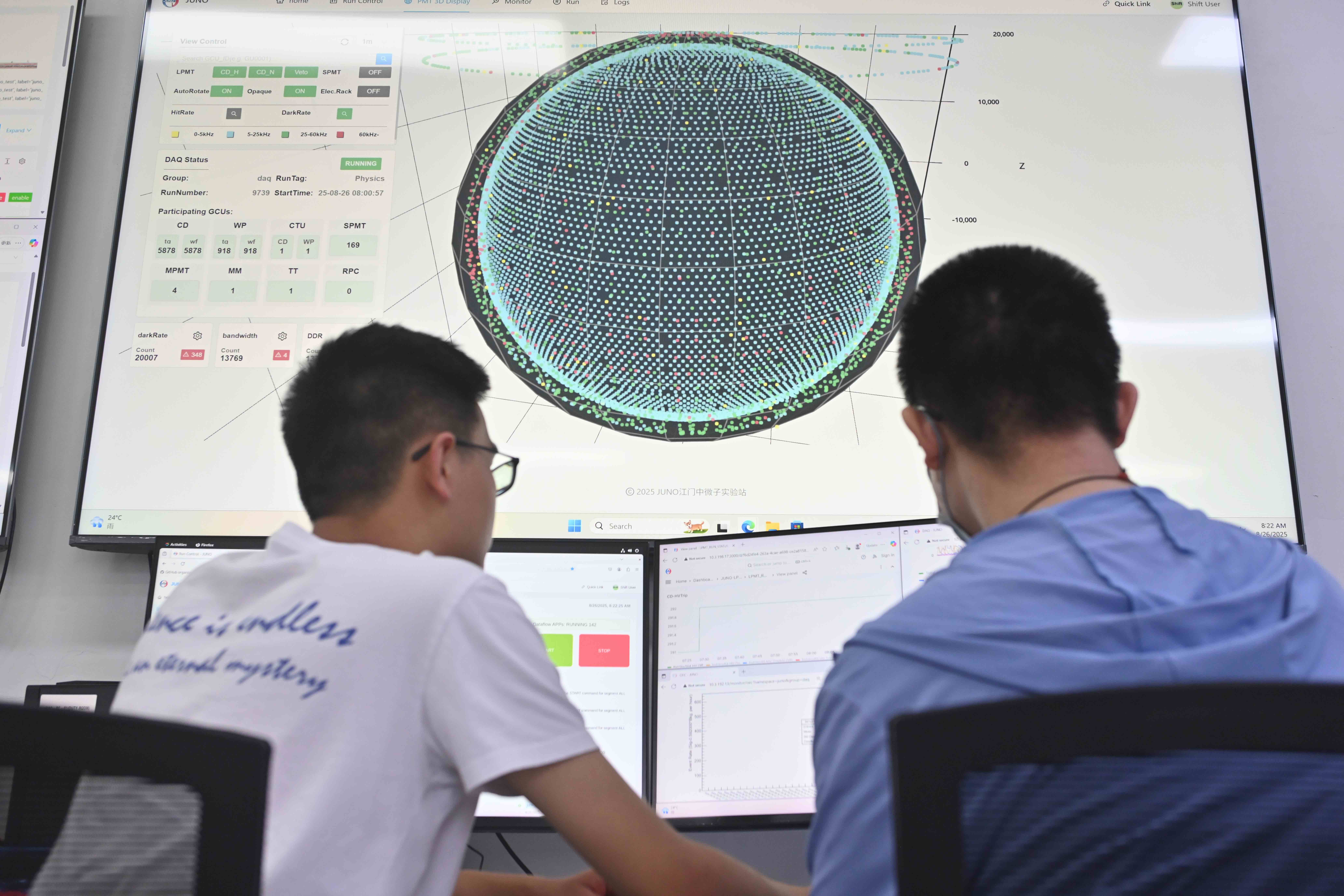 江门中微子实验现场值班人员密切关注探测器运行取数。中国科学院高能物理研究所供图