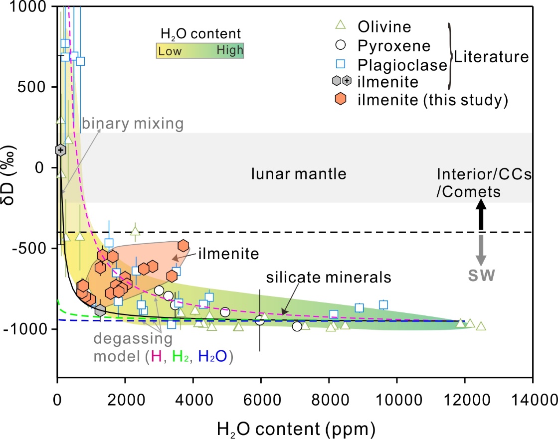 联合团队采用纳米离子探针-透射电镜分析技术,对嫦娥五号月壤中挑选出的11个钛铁矿颗粒(样品编号:CE5C1000YJFM00404和CE5C0600YJFM00503)进行了系统分析。结果显示,钛铁矿颗粒表层约100 nm的风化层中水含量为730-3700 ppm,δD值为-884~-482‰,指示颗粒表层的水主要来源于太阳风注入。然而,在这些分析的钛铁矿中,未发现类似于硅酸盐相物质中发现的极高水含量(6000ppm至>10000 ppm),且其δD值也明显偏高(图1)。