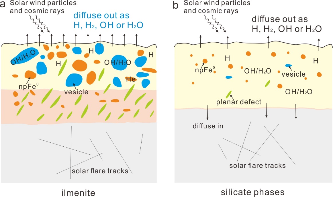 本研究首次阐明了钛铁矿月壤颗粒在月表水的分布和储存中扮演的双重作用。一方面,钛铁矿能够通过与太阳风的高效相互作用,促进太阳风H向水的转化;另一方面,受其晶体结构特性限制,钛铁矿风化层中生成的水难以长期稳定保存。该发现不仅为解释遥感观测中月球富钛区域水的显著日变化现象提供了可能的矿物学机制,同时也为未来以钛铁矿为主要对象的月球原位资源开发提供了重要科学依据。。