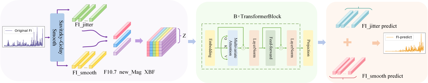 全日面耀斑指数(Flare Index, FI)综合表征了一段时间内太阳耀斑活动的频度和强度,是衡量全日面耀斑活动水平的重要量化参数。受活动区快速演化、磁场重联过程等因素影响,FI序列同时包含缓慢变化的背景活动与突发增强的短期扰动,呈现出显著的非平稳性和复杂性。为此,中国科学院国家空间科学中心太阳活动与空间天气重点实验室罗冰显研究员团队研发了基于全日面耀斑指数的双阶段太阳耀斑预测方法。首先,采用“趋势–扰动”分解策略,将全日面耀斑指数拆分为刻画太阳活动缓慢演化的长期趋势分量和反映爆发事件的短期扰动分量,并分别利用时序建模能力突出的 iTransformer 深度学习模型进行独立预测,再对两部分结果进行融合以获得FI预测值。在此基础上,进一步构建回归–分类一体化的第二阶段预报框架,将预测得到的FI映射为不同耀斑强度等级,实现从连续指数到离散耀斑等级的联合预报。该双阶段深度学习模型为提升全日面耀斑预报的准确性与稳定性提供了一种新的技术途径,其输入参数的简单、实时易获取性也为模型在耀斑预报的业务集成提供了快捷通道。