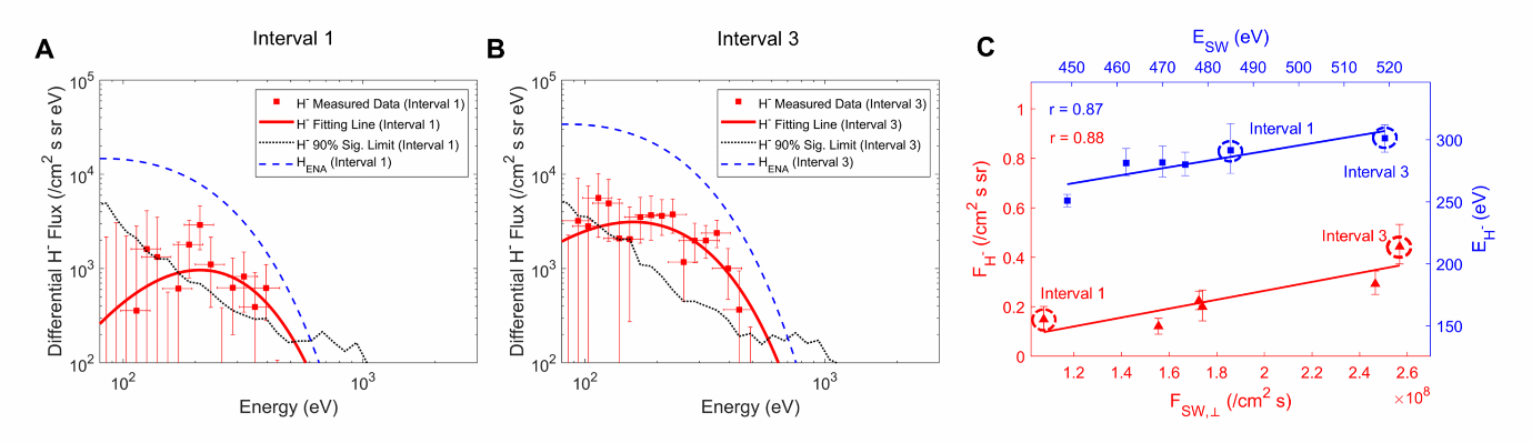最近来自中国科学院国家空间科学中心的博士生仲天华、谢良海研究员、张爱兵研究员和王赤院士等人与国内外单位合作,将NILS获取的H⁻能谱与ARTEMIS卫星同期观测的上游太阳风参数进行了系统分析。结果显示,H⁻积分通量与太阳风法向通量之间存在强正相关(r=0.87),H⁻平均能量与太阳风能量同样呈强正相关(r=0.88)。太阳风通量最高时段的H⁻通量约为最低时段的三倍。这些结果为其起源于太阳风与月表相互作用提供了直接观测证据。此外,H⁻平均能量集中在250–300 eV,说明这些负离子主要由太阳风在月表的散射过程产生。将H⁻能谱与ENA经验能谱对比还发现,H⁻在低能段通量相对更低,这与固体表面负离子出射的速度依赖性理论预测一致,即速度较低的负离子在离开表面时其电子具有更高概率隧穿回表面,导致负离子损失一个电子而被中性化。