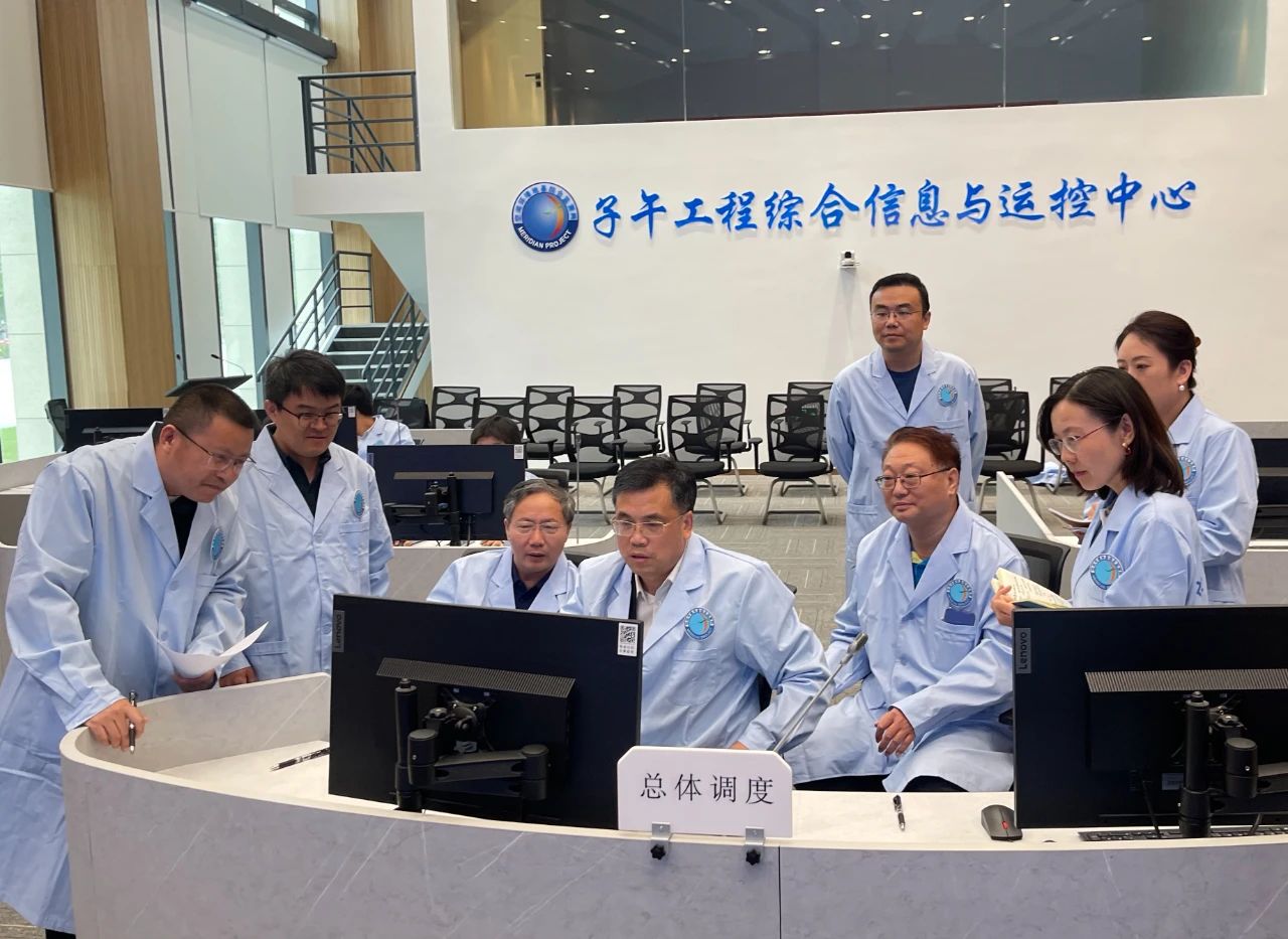 子午工程二期总指挥王赤(左4)在子午工程综合信息与运控中心指导工作。
