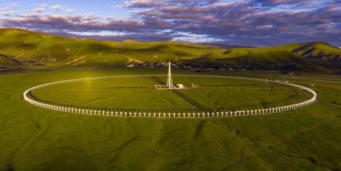 “千眼天珠”位于四川稻城县海拔3830米处,是目前全球最大的综合孔径射电望远镜。装置中,313台直径6米的天线均匀分布在1公里直径的圆环上,像向日葵一般跟着太阳转动,圆环正中心是一座百米高的定标塔。