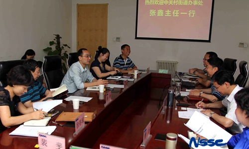 黄康平书记代表空间中心对张鑫一行的到访表示热烈欢迎,并对街道长期以来的支持表示感谢。中心综合办主任范全林汇报了空间中心科技创新情况。张鑫主任介绍了中关村街道的工作及近期工作安排,希望和我单位加强沟通,提供服务。随后,与会人员就空间中心周边环境、治安、空间社区改造等问题进行了细致的讨论,双方相互交换了意见,取得了共识。