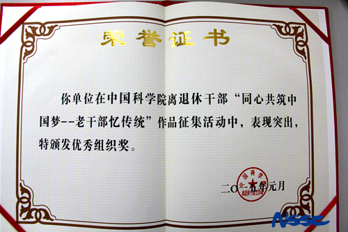为迎接中国科学院建院65周年,中国科学院离退休干部局开展了“同心共筑中国梦 老干部忆传统”活动,在此活动中,空间中心老干部用他们独特的视角记录了祖国65年复兴道路上的点滴回忆,老干部共有8篇文章入围获奖,获奖者为:吴智诚、杨俊文、胡南宁、许彦琴、殷秀兰、况园珠、潘友信。