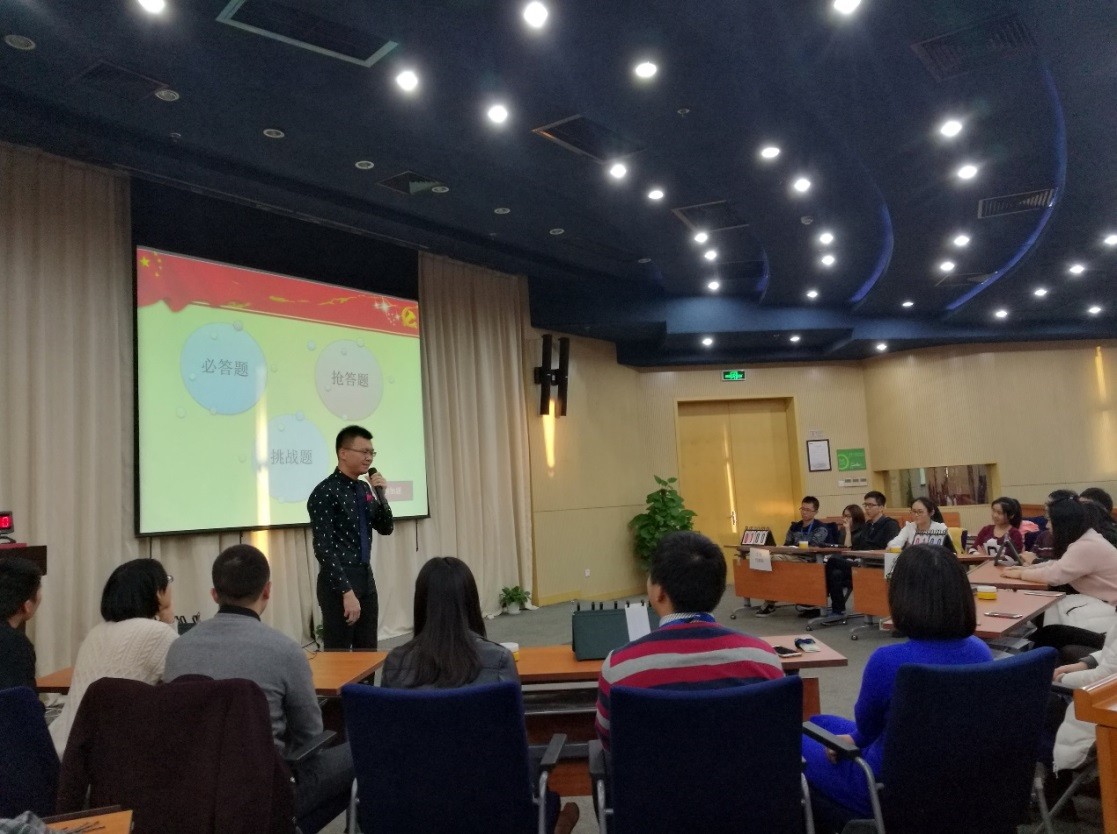 本次竞赛共有六支队伍参与角逐,每个支部各派两支队伍参赛,每支队伍有三名选手,活动分必答、抢答、挑战和互动四个环节。选手们准备充分,必答环节全部答对,不分胜负;抢答环节掀起比赛高潮,选手们集中注意力,手不离抢答器,分值此起彼伏,竞争十分激烈,第二轮过后,比分有所拉开;挑战环节是真正一决胜负的时刻,设置有10分、30分、50分三个档次的题目可选,相对保守的队选择了10分或30分的题,敢于冒险的队则选择了50分的题。最终研究生第二党支部未历航、卜萱、程旋代表队勇夺一等奖。在互动环节中,观众们也争先恐后,踊跃答题,现场气氛十分热烈。