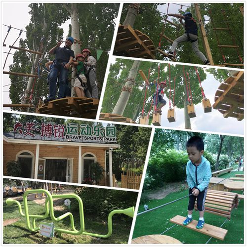 大美搏锐运动公园取自“拼搏、锐意、进取”的内涵,内设有丛林穿越高空拓展、球体攀岩、空中滑索、草坪蹦床等项目。丛林穿越通过在树林间设置各种难易不同、风格迥异的关卡,让孩子们体验丛林攀爬及林间穿越的感受。虽然有些关卡特别难走,有的孩子甚至吓得哇哇大哭,但最后仍能突破自我,完成挑战,在丛林穿越的过程中熔铸了精神。