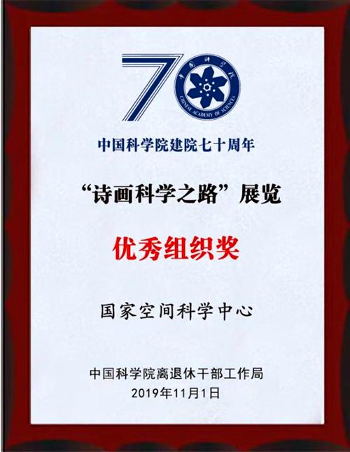 空间中心作为特邀单位参加了活动。经过广大职工的共同努力,空间中心推送的由宋金伟制作的版画、苏子安配诗的优秀科学家吴季的诗画作品,经过专家评选荣获“诗画科学之路”展览优秀组织奖。