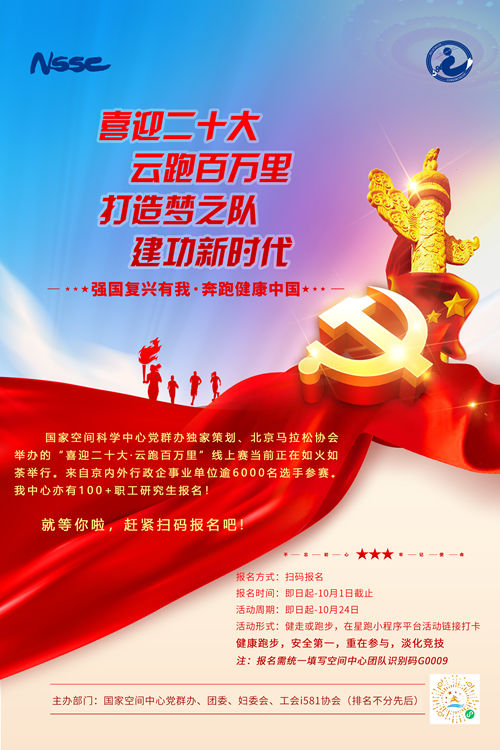 伴随着党的101岁生日的到来,为响应中共中央宣传部印发《关于迎接党的二十大胜利召开组织开展“强国复兴有我”群众性主题宣传教育活动的通知》精神,由空间中心党群办独家策划、中心团委和妇委会联合发起、工会i581跑团特别支持,北京市体育总会主办、北京市马拉松协会承办的“强国复兴有我·奔跑健康中国”喜迎二十大云跑百万里活动轰轰烈烈的拉开了帷幕,正在如火如荼举行。