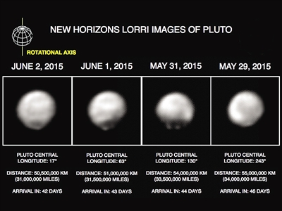 NASA与约翰斯·霍普金斯大学应用物理学实验室和西南研究院2015年6月11日制成的“新地平线”号探测器所摄冥王星照片的对比图。