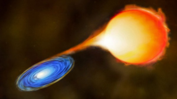 白矮星能从同伴身上“偷走”氢和氦,以积累其外层。图片来源:CXC/M. WEISS 关于超新星,人们通常知道的是,首先一颗貌似无伤大雅的恒星在毫无征兆的情况下突然燃烧起来,明亮程度堪比整个星系。现在,天文学家就发现了这样一颗似乎正处于大爆炸边缘的恒星。 这颗代号为M31N 2008-12a的仙女座恒星早在2008年经历新星爆炸期间就已经被发现。所谓新星爆炸,是指一颗白矮星——即恒星(例如太阳)燃烧残骸——与另一颗正常恒星成对相互绕转时,较小、较稠密的白矮星从其同伴身上“偷走”氢和氦,用来积累其外层(如上图)。当外层累积到足够厚时,引发核聚变,瞬间喷射出物质,并达到太阳亮度的几十万倍,即一个新星的亮度。 新星数量稀少,而那些反复喷发外层物质的新星则更少;目前所知的也仅有极少数的几颗。M31N 2008-12a就是其中之一。从2009年到2015年,它共经历了5次新星爆发,这比其他新星反复爆发的频率要高得多。 近日,在英国兰迪德诺召开的国家天文学会议上,一个天文学家小组声称他们利用利物浦望远镜(The Liverpool Telescope)和NASA的“雨燕”X射线天文台(Swift)的观测结果,发现这颗白矮星应该正处于达到临界质量的前夕——其临界质量为太阳质量的1.4倍。 超过临界质量后,一次强度更大、涉及恒星中心碳元素的核聚变反应将被激发。白矮星将在数秒内爆炸、分裂,释放出比几十亿颗太阳还要亮的光芒。