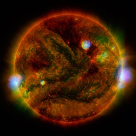 美国国家航空航天局(NASA)的原子核光谱望远镜阵列(NusTAR)拍摄到的高能X射线被标为蓝色,日本Hinode航天器拍到的低能X射线被标为绿色,NASA太阳动力学天文台(SDO)拍摄的强烈的紫外线被标为黄色和红色。