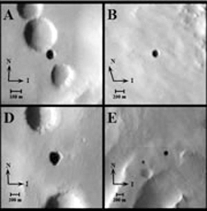 据报道,美国地质探测局的科学家格伦·库欣分析了“奥德赛”探测器上安装的热辐射传感器获取的火星地表图片,并发现在一处凹陷的地区存在七个直径大约在