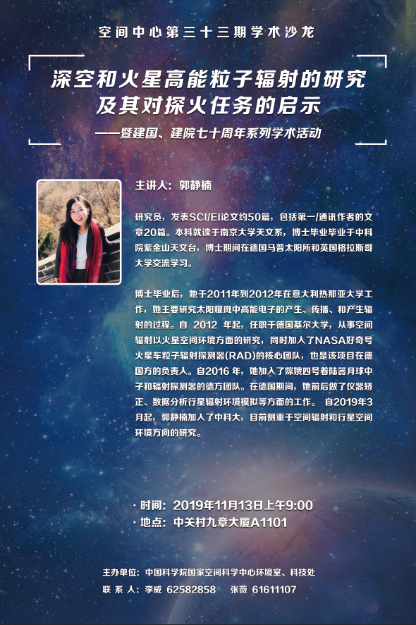 (11月13日)深空和火星高能粒子辐射的研究及其对探火任务的启示——空间中心第三十三期学术沙龙