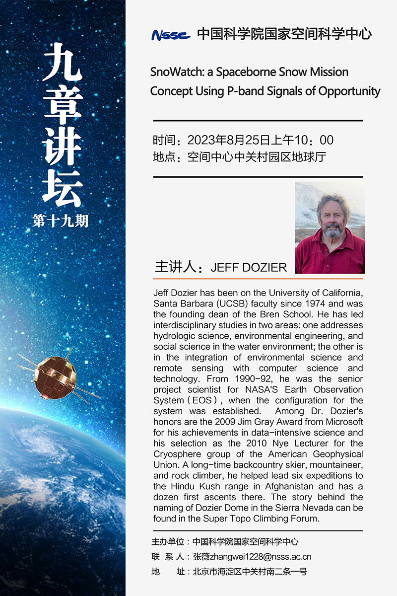 Mountain watersheds play an outsized role in global hydrology and function as “water towers” for 1/6th of the global population and its economy. Mountain snow provides a key source for agricultural and urban water supply, hydropower, recreation, and ecosystems. These historically reliable natural reservoirs are susceptible to both climate change and socioeconomic pressures. Despite the need for information about snow water equivalent (SWE) in the mountains, current spaceborne capabilities lack the ability to track the seasonal evolution of mountain snow across the necessary spatial and temporal scales. Properly capturing seasonal snow dynamics is necessary to constrain models and their projections of current and future snow-derived water resources. My presentation reports on the development of a new mission concept for the remote sensing of terrestrial snow. We propose a P-band Signal of Opportunity (SoOp) synthetic aperture radar (SAR) concept to take advantage of signals already being broadcast by existing communication satellites. The phase and amplitude of the signal reflected from terrestrial surfaces can be measured using receivers on a constellation of small satellites. P-band signals with wavelength 0.8 to 1.0 m are attractive because they penetrate deep snow and forest canopies found in mountain environments, with limited sensitivity to snow microstructure and stratigraphy that can confound retrievals at shorter wavelengths. Measured phase changes in the reflected signal yield SWE of dry snow independent of depth or density, or snow depth if the snow is wet. Moreover, the amplitude of the reflected signal yields retrievals of root zone soil moisture, which provides additional insight into the antecedent conditions before snow and the partitioning and fate of snow meltwater into soil water storage vs. runoff. The concept proposes using a formation flight of small satellites to allow the use of interferometric SAR processing to obtain a spatial resolution of a few hundred meters and a swath widt