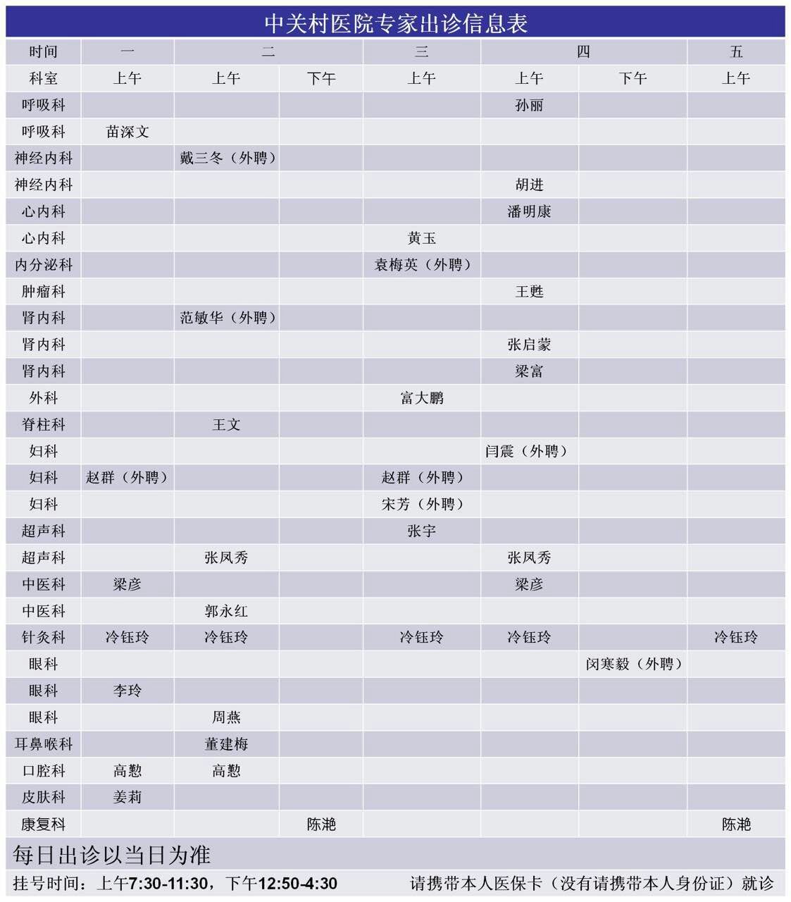 中关村医院近期有三甲医院专家出诊(详见附件),有就诊需求的可电话联系或预约。中关村医院预约电话:82548695。(温馨提示:中关村医院必须选为定点医院才可持医保卡就医)