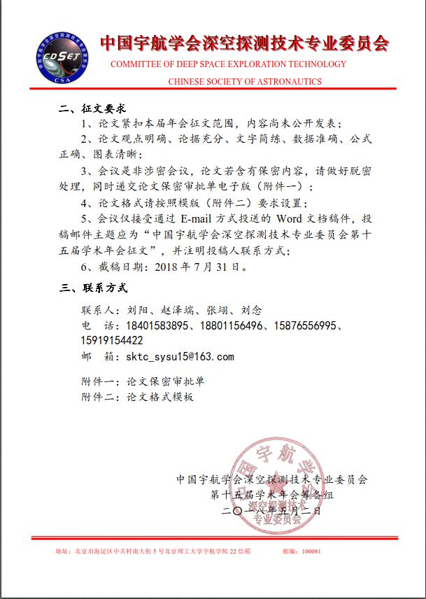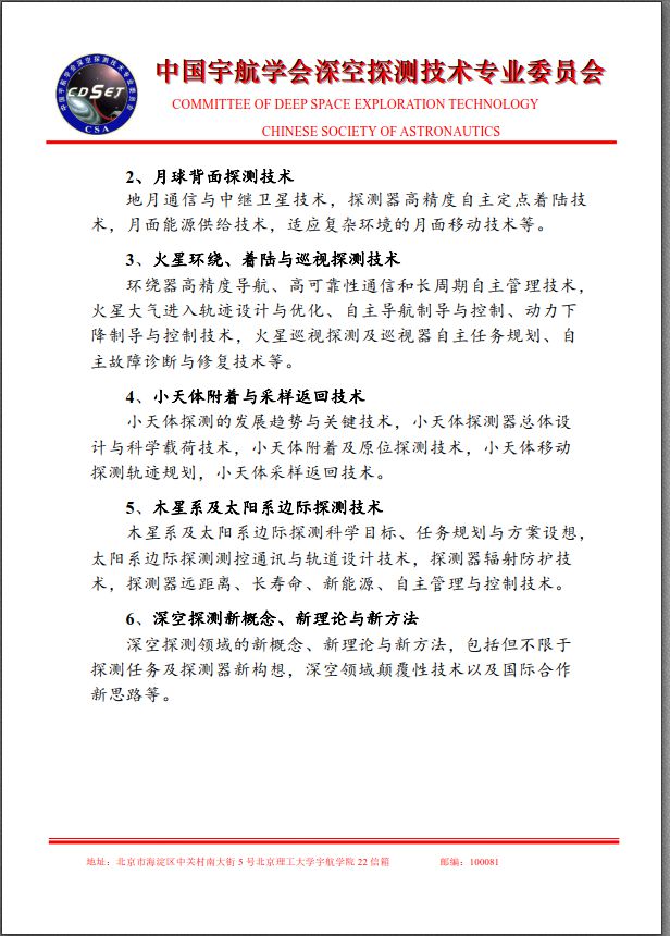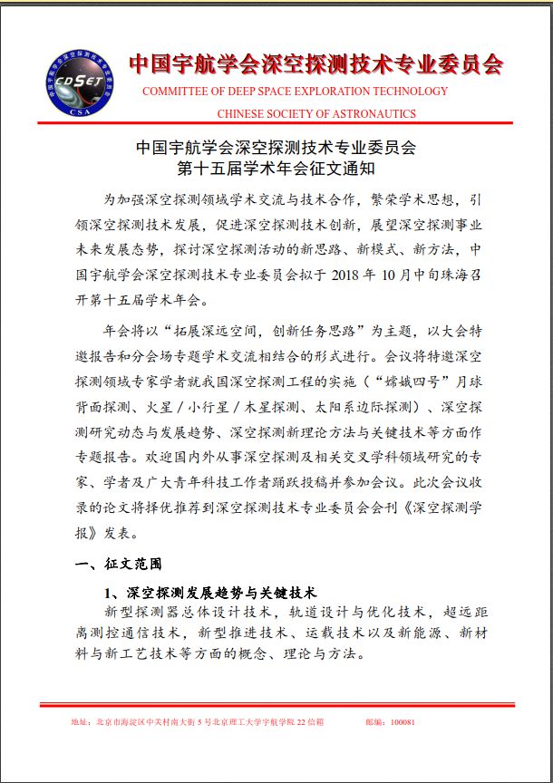 中国宇航学会深空探测技术专业委员会第十五届学术年会征文通知