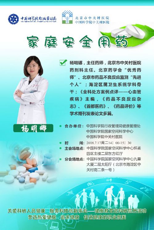 根据中科院党组“3H工程”的部署,为切实加强京区科研人员的医疗保健工作,倡导广大职工文明、健康、科学的生活方式,提高科研人员维护健康的能力,空间中心与中科院行政管理局健康管理处协同中关村医院将联合举办健康讲座“家庭安全用药”。该讲座由中关村医院药剂科杨明娜主任药师为大家主讲,杨主任是《全科处方案例点评--心血管疾病》主编,曾在《首都医药》、《药品评价》等学术期刊发表过多篇论文。此次健康讲座机会非常难得,讲座内容是大家日常生活中的家庭用药,十分受用,欢迎广大职工积极参与。