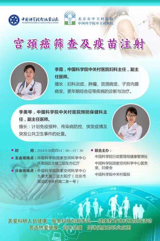 根据中科院党组“3H工程”的部署,为加强京区科研人员的医疗保健工作,中心医务室、妇委会联合举办健康讲座“宫颈癌筛查及疫苗注射”,该讲座由中关村医院妇科李霞主任及预防保健科主任李美琴主任主讲。此次健康讲座会详细介绍宫颈癌的发病及目前最新的疫苗情况,内容与每位女性同胞息息相关,欢迎广大职工积极参加。