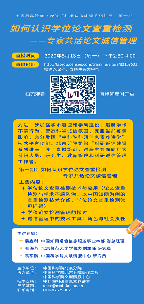 为贯彻落实2020年全院科研诚信建设工作视频会精神,加强学术道德和学风建设宣传教育,结合疫情防控工作要求,北京分院将开展 “科研诚信建设系列讲座”线上直播培训活动。(本次活动具体安排见海报)