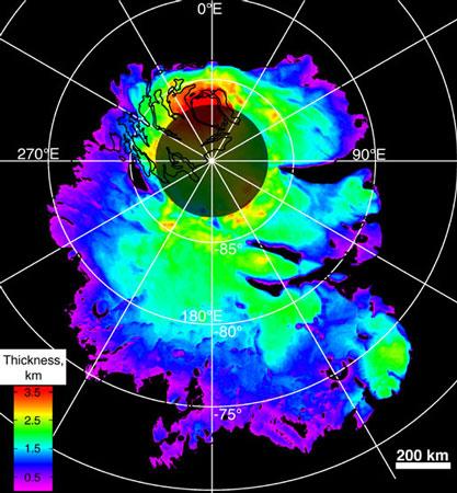 美宇航局公布的南极冰沉积物分布图。图中颜色代表冰层的深度大小,红色表示厚度为
