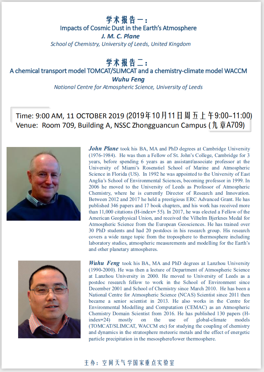 (10月10日)Impacts of Cosmic Dust in Earth's Atmosphere & A Chemical Transport Model TOMCAT/SLIMCAT and a Chemistry-climate Model WACCM