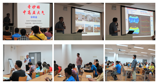 “徐老师,Sprite这个名字的由来是什么?” “徐老师,中高层大气的主要成分是什么?” “徐老师,在中国的哪些地方能观测到夜光云?” “徐老师,如何区分城市灯光和中高层大气的气辉辐射?” …… 这些问题均来自北京天文馆的B505教室聆听讲座的老中青听众和中小学生。2015年9月19日下午,空间天气国家重点实验室徐寄遥研究员应北京天文馆邀请,主讲北京天文馆2015年公众科学讲座系列之十五,讲述了“奇妙的中高层大气”,将深奥难懂的中高层大气的物理过程通过图片、音频和视频方式展现在公众面前,并与聆听讲座的听众互动,众多听众积极提问,激发了学习科学的兴趣。 徐寄遥研究员从与我们所熟知的物理现象对比的角度通俗易懂地向听众讲述了中高层大气基本物理规律,介绍了发生在中高层大气中绚丽多彩的物理现象。大量的图片展示、音频和视频播放,把听众的思绪紧紧地联系在中高层大气的物理过程中,揭开了中高层大气神秘的面纱,解答了一系列的关于中高层大气的问题:最冷和最热的地方、中高层大气中云的成份、中高层大气闪电、夜间是否真的一片漆黑、低层大气灾害性事件对中高层大气的影响、以及中高层大气中类似于海洋的潮涌现象,等等。同时介绍了空间天气学国家重点实验室中高层大气研究团队自主研制设备,在我国开展的中高层大气地基组网观测的进展与成果,并且结合自身的野外观测经验,讲述了在野外进行科学观测的诸多乐趣,让大家更加有信心去克服困难,收获科学成果,激励着青少年朋友攀登科学高峰。 北京天文馆于2015年在每个月的第三个周六举办一次公众科学讲座,邀请各个行业的专家进行公众科普宣传,形成学习科学和宣传科学的良好氛围,得到社会上众多听众,尤其是中小学生及其家长的欢迎和认可。