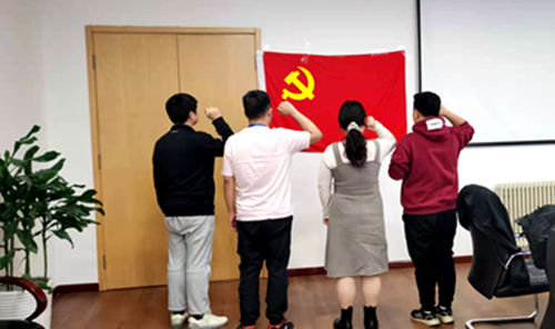 其次,杨紫骞、刘璠、刘鹏程、王添四位入党积极分子分别宣读了入党志愿书,入党介绍人从工作上、生活上和思想上对四位积极分子给予较高的评价,推荐四位同志加入中国共产党。经与会党员充分讨论,一致同意接收杨紫骞、刘璠、刘鹏程、王添为预备党员,四位预备党员在党旗下庄严宣誓,正式加入中国共产党。
