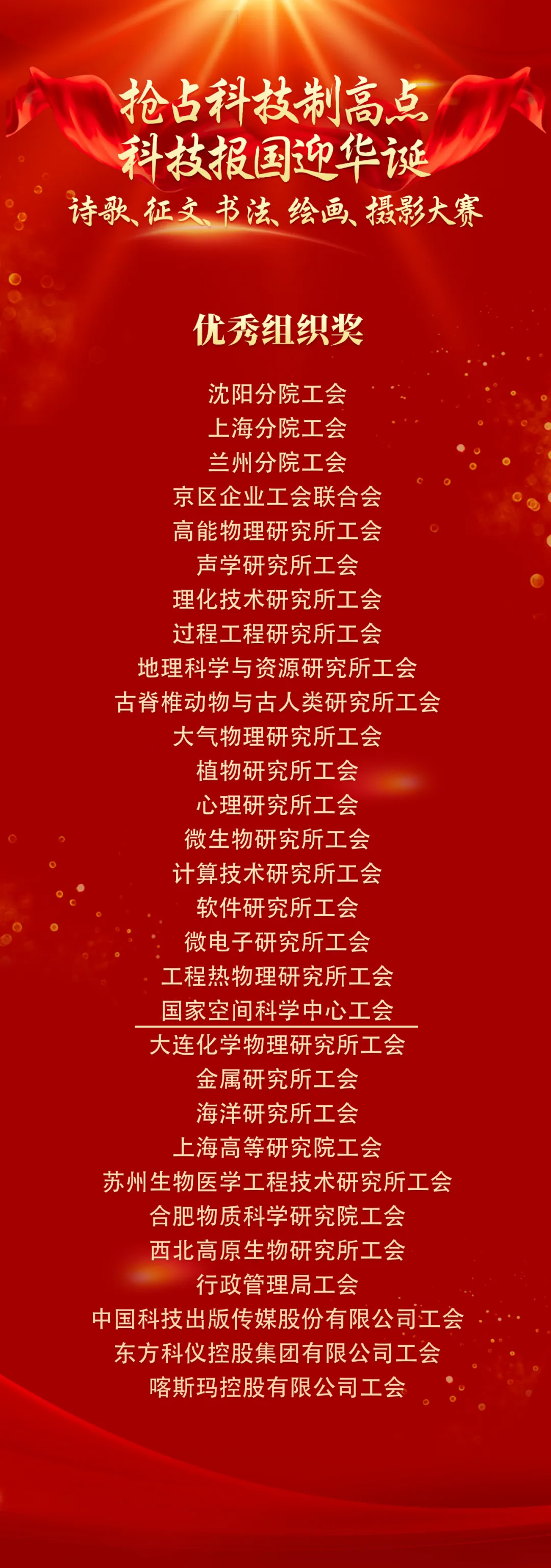 为庆祝新中国成立75周年和中国科学院建院75周年,展示新中国成立以来走过的光辉历程、取得的辉煌成就,展现我院为国家做出的突出贡献,抒发广大职工爱党爱国爱院的情怀,院工会组织开展了“抢占科技制高点 科技报国迎华诞”诗文书画摄影大赛活动。