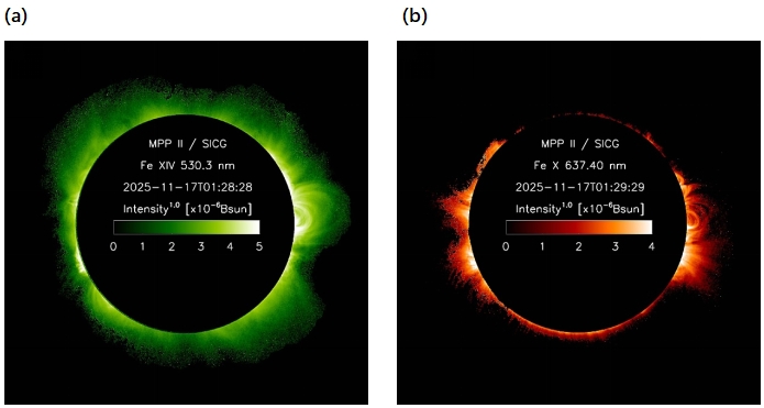 (a) Fe XIV 5303Å谱线强度图,可以有效探测温度为2MK左右的日冕;(b) Fe X 6374Å谱线强度图,可以有效探测温度为1MK左右的日冕;(c) Fe XIV 5303Å多普勒速度图,反映视线方向(LOS)的等离子体运动(单位为 km s⁻¹);(d) Fe XIV 5303Å谱线宽度图,其物理来源通常包含热展宽+非热展宽(波动/湍动/小尺度流动等)。[供图:山东大学(威海)空间科学与技术学院,付辉教授]