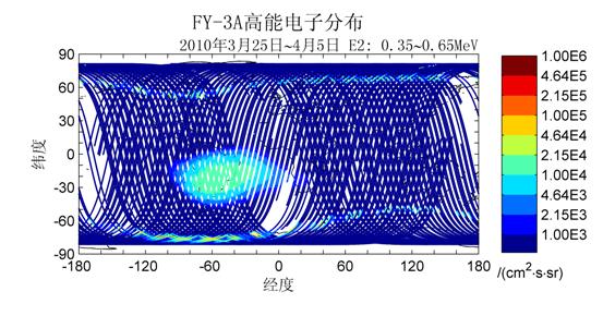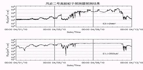2010年4月3日,日冕物质抛射(CME)发生;4月5日影响到地球空间,引发了地磁扰动;4月6日,搭载于我国气象系列卫星风云二号卫星(36000公里高空)、风云三号卫星(830公里高空)上、由中科院空间中心研制的空间环境监测器——高能粒子探测器,观测到同步轨道高能电子出现快速增强,并在随后长达6天的时间内维持在高通量水平,其中大于2MeV的高能电子显著增强,较扰动前电子背景通量高出2个量级左右;直至北京时间4月12日3时左右,高能电子通量陡降至扰动前背景通量水平。