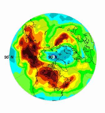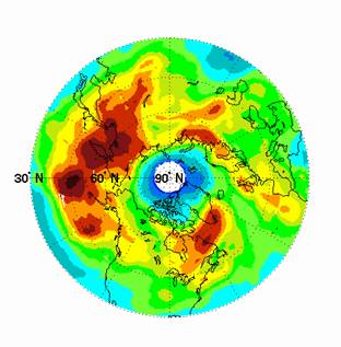 中国科学院空间科学与应用研究中心自主研制的风云三号气象卫星紫外臭氧总量探测仪在北极上空监测到一个明显的臭氧低值区,在该低值区内臭氧总量是正常情况下平均值的一半左右,部分地区的臭氧总量达到了臭氧洞的标准(220DU)。虽然没有形成南极上空那样规模的臭氧洞, 但由于北半球人口密度远高于南半球,臭氧低值区覆盖的范围内紫外线对人类健康的影响比南极臭氧洞更重要。