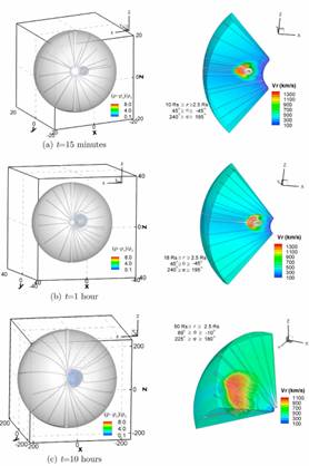 左图:CME的演化过程,15分钟,1小时和10小时;右图:模拟值(实线)与观测值(虚线)的比较