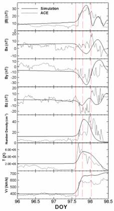 沈芳研究员等利用异步并行时间推进法,采用无反射边界条件,将磁场观测作为输入,对2000年4月CME事件进行了三维MHD数值模拟。在背景太阳风基础上,采用带磁性的等离子体团模型并引入三维CME,数值模拟了CME从源表面到L1点附近的传播,并与ACE飞船的观测进行了比较,其中等离子参数及磁场均吻合较好,blob模型对模拟行星际磁场Bz分量的南北偏转也有着不错的效果。同时,他们还对该事件进行了三维Cobpoint (Connecting with the OBserver POINT) 的相关研究。Cobpoint随着激波前沿改变且沿着连接飞船与太阳的磁力线运动,是进行磁流体与粒子混合模拟研究的重要因素之一。