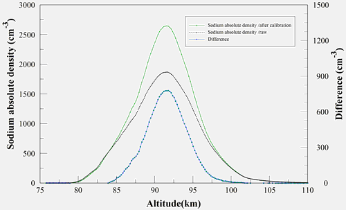 图二:钠层绝对数密度校正(Green)与原始(Black)比较