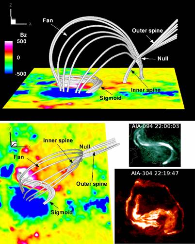 为获得爆发前准静态的磁场位形,作者利用之前开发的高性能日冕非线性无力场外推方法,重构了和观测一致的三维磁场(见图二)。通过对爆发前磁场的定量分析和磁拓扑解析,发现了爆发前活动区内存在特殊的所谓“Sigmoid”的 S 形磁绳,其观测表现为极紫外的高温S形日冕环;此外,该研究组还发现在磁绳和其束缚磁场之间还存在潜在的电流环不稳定性(Torus instability),在背景场内存在一个日冕磁零点(Magnetic null);种种迹象均表明该次爆发事件极有可能是发生于磁零点的磁场重联削弱了背景场的束缚力,使磁绳产生了一定的膨胀,并触发了电流环不稳定性,从而导致了最终的爆发。模拟结果有力地验证了这一过程,并与太阳动力学卫星(SDO)的观测完美吻合。