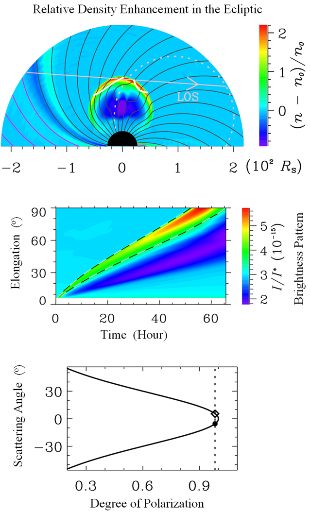 近年来,中科院国家空间科学中心空间天气学国家重点实验室的熊明、冯学尚、刘颍与英国STEREO/HI仪器组的Jackie Davies、Mathew Owens、Richard Harrison、Chris Davis合作,从白光成像的物理本质机理(自由电子的汤姆逊散射)入手,建立内日球层的磁流体力学数值模型,将磁流体数值模拟的正演和白光遥感观测数据的反演相结合,建立行星际CME动力学和白光成像表观的对应关系。该研究揭示:(1) 行星际CME的白光表观显著依赖于观测视角,汤姆逊散射的几何效应在大的观测延展角尤为显著;(2) 借助白光偏振度和射电法拉第旋转的联合测量,能够从行星际CME的白光亮度影像更准确地推断CME空间位置。该项成果发表于美国《天体物理学报》(Astrophysical Journal)和欧洲《太阳物理》(Solar Physics)。