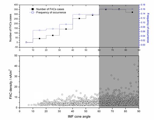 该项研究利用欧空局Cluster星簇计划四颗卫星的探测数据,通过对2001和2004年7至11月间1839个磁尾PSBL区场向电流事件进行统计分析,首次揭示了IMF时钟角和锥角与场电流发生率及密度之间的关系。研究表明,磁尾PSBL区场向电流的发生率会随IMF时钟角的增大而增大,并在IMF锥角等于-90º和+110º时出现两个峰值;与其在-180°<φ<0°范围内的发生率相比,场向电流的发生率在0°<φ<180°的范围内更高,这表明场向电流更易发生在IMF昏向条件;与其在|φ|< 90°范围内的发生率相比较,场向电流的发生率在90° < |φ|< 180°的范围内更高,这表明场向电流更易发生在IMF南向条件下。该项研究还进一步揭示,密度大的场向电流通常出现在60º<|φ|<120º的范围内,且IMF昏向条件下的密度会更大。