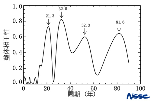 图1 太阳黑子数与全球平均温度的小波相干性随周期分布,图中21.3年,、52.3年和81.6年的共振周期接近太阳活动的22年、50年周期和世纪周期