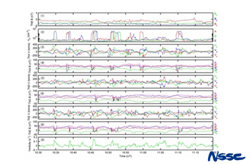 存在速度剪切的两种流体的边界上很容易激发Kelvin-Helmholtz表面波,这种表面波增长到非线性阶段就表现为Kelvin-Helmholtz涡旋。在空间等离子体中,典型的例子是在距离地球近乎十万公里以外的地球磁层晨昏侧翼的低纬边界层,由于磁鞘的速度剪切引起的Kelvin-Helmholtz涡旋结构。根据前人的理论推测和数值模拟,这种涡旋结构更容易在行星际磁场北向条件下发生,而已有的卫星观测证据几乎都是在行星际磁场北向条件下观测到的,并且被认为是行星际磁场北向条件下太阳风向磁层传输的重要途径。而在行星磁场南向条件下所观测到的Kelvin-Helmholtz涡旋,则只有Hwang等人利用Cluster卫星的观测数据报告过。行星际磁场南向条件下Kelvin-Helmholtz涡旋的观测特征及其对太阳风向磁层传输的作用,因缺乏足够的卫星观测证据,目前尚不清楚。