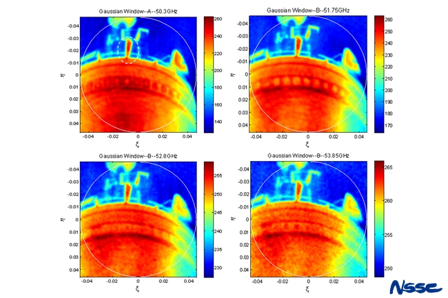 该团队从九十年代中期在国内首先开始这一领域的研制工作,并于2001,2003年先后研制出两部机载遥感器,成功获得了一系列不同的地物目标的傅里叶域的采样和亮温反演图像。特别是该团队发明的时钟扫描成像方法为国际首创。2010年该团队研制出的地球同步轨道被动毫米波成像仪为国际上空间分辨率最高的该类仪器。该仪器的成像结果近期在IEEE地球科学和遥感学报(IEEE Transaction on Geoscience and Remote Sensing)上发表(见文后链接)。该成像仪采用分布在直径2.8米的圆环上的稀疏小天线阵列,通过圆环的旋转获得各个方向上不同基线长度的傅里叶域采样。这一设计大大减少了天线单元数,减少了重量、功耗和成本,而且其成像分辨力与一个5.6米的实孔径天线相当。该仪器为我国在国际上率先开展地球同步轨道微波成像探测奠定了良好的基础。