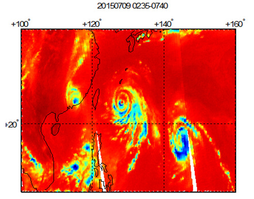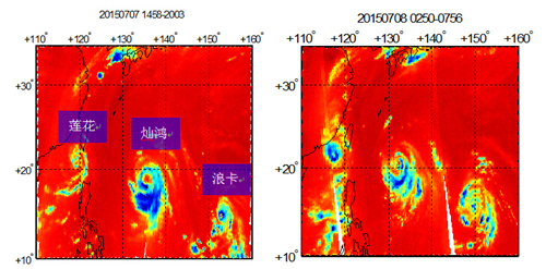 截止到7月10日,1509号台风“灿鸿”仍以超强台风形式继续向西北方向移动,预计在11日上午浙江及附近区域沿海登陆,台风“浪卡”于上午8时左右在我国钓鱼岛东偏南方向的西北太平洋面上,根据监测数据显示,未来五天对我国海域无影响,FY-3B星微波湿度计将继续监测上述台风,为气象预报人员提供准确实时的参考信息。