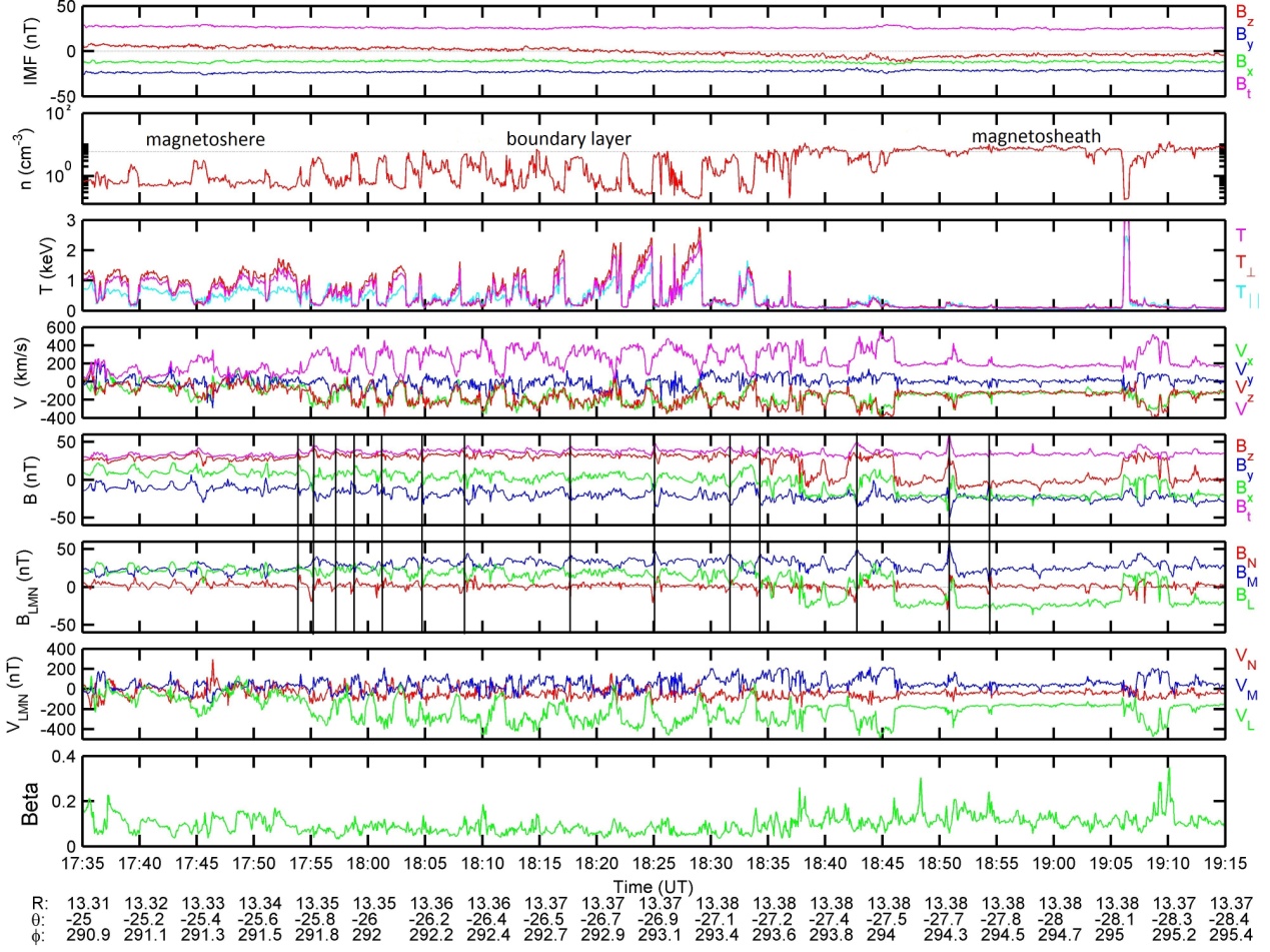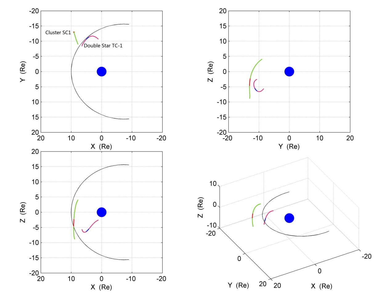 TC-1卫星在晨侧在磁地方时约为8:00的向阳面晨侧磁层顶位置观测到一连串等离子体高速流,速度可达500km/s,明显超出了磁鞘太阳风的背景速度,卫星在此条件下多次穿越了磁层顶,并伴随磁场位型由北向的磁层磁场位型转为行星际磁场南北分量 Bz≈0 nT的磁鞘磁场位型,等离子体在磁层顶位置出现被加速的高速流,同时在磁层顶内侧的边界层里,高速流也相当连续地持续出现了大约1个小时,并受到磁层顶运动的调制。Wallén 试验表明,这些高速流确由磁场重联产生,并于磁场重联理论模型所预测的Alfven加速是一致的,并且分析表明卫星位于重联区域的南侧,这与已有的关于磁层顶重联位置的预测吻合。对等离子体探测数据的进一步分析表明,在高速流持续的大约1个小时里,磁场重联是准连续的发生的,这与以前所观测到的连续重联过程有所类似。与此同时,卫星还观测到与上述稳态过程并存的瞬态过程——通量传输事件(FTE), 长久以来对此争论颇多,一般认为磁场重联要么是稳态的,要么是瞬态的。但此次TC-1的观测到的是稳态的准连续重联过程背景下存在着瞬态的FTE过程,目前认为FTE可能是由准连续重联和磁层顶运动产生,也可能是与外界驱动无关的一连串的等离子团所形成。考虑这次观测中特殊的行星际磁场条件以及卫星位于晨侧磁层顶,这样的准连续重联对于研究磁层顶重联模式以及由此引起的太阳风向磁层输运的效率等问题,具有重要的参考价值。