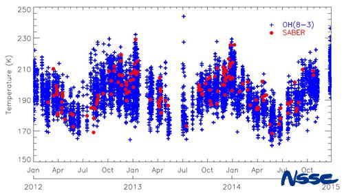 2012-2014年期间, 利用我们地基探测的OH气辉光谱数据,并采用最优的爱因斯坦系数计算的OH(8-3)带转动温度(蓝色)和地基观测台站上空TIMED/SABER卫星探测的温度(红色)随时间的变化。