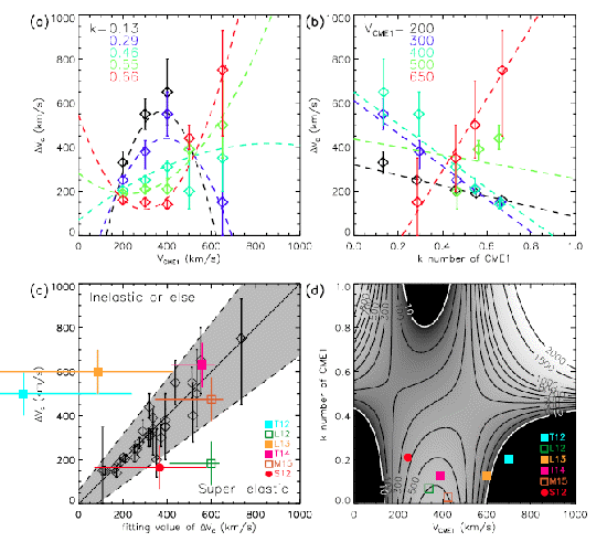 近几年来,空间天气学国家重点实验室冯学尚课题组围绕CME相互作用过程开展了一系列的数值模拟研究, 研究成果发表在Geophysical Research Letters,Journal of Geophysical Research等重要刊物上。其中,沈芳等人利用三维数值模拟方法分析了两个慢速CME之间碰撞后的能量转换的研究成果以封面文章的形式发表在Geophysical Research Letters上。此次该课题组在前面工作的基础上,选取大量具有不同初始速度及初始能量的CME相互作用事件进行了一系列的三维MHD数值模拟,定量研究了CME初始速度及k-number对CME之间碰撞机制的影响(图1),结论表明,两个CME之间的初始速度差越低,就容易发生超弹性碰撞,而临界初始速度差(ΔVc),即发生完全弹性碰撞时的初始速度差,与k-number呈线性相关,与第一个CME的初始速度(VCME1)呈近似的二次相关,而CME的初始速度及k-number均可以由观测得到。本研究对于进一步理解空间等离子体的动力学过程、CME之间碰撞过程的物理机制及能量转换过程提供了新的思路与方法,对认清灾害性空间天气事件的日冕行星际过程具有重要科学意义。