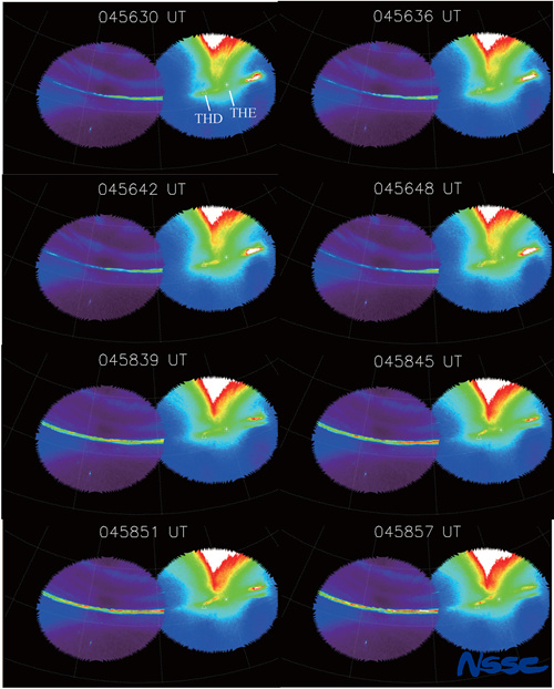 图2 亚暴膨胀相过程中观测到的KAW本征波模期间对应的极光增亮。