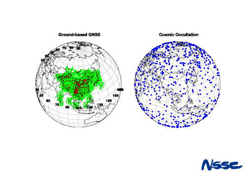 图1:地基GNSS台站及星下点覆盖范围(左);COSMIC掩星事件全球分布示例(右)
