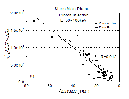 研究人员通过进一步统计分析近15年的地球同步轨道卫星数据和地面台站的观测资料,发现这些亚暴对SYM-H贡献线形正比于注入的能量粒子通量(图2)。